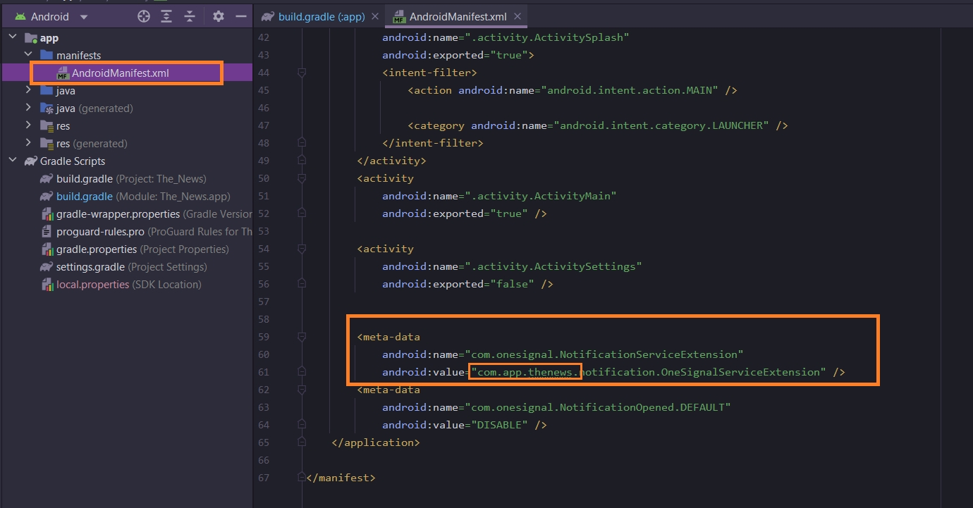 OneSignal for sending push notification, you must manually change the NotificationServiceExtension value in the AndroidManifest.xml according to your package name