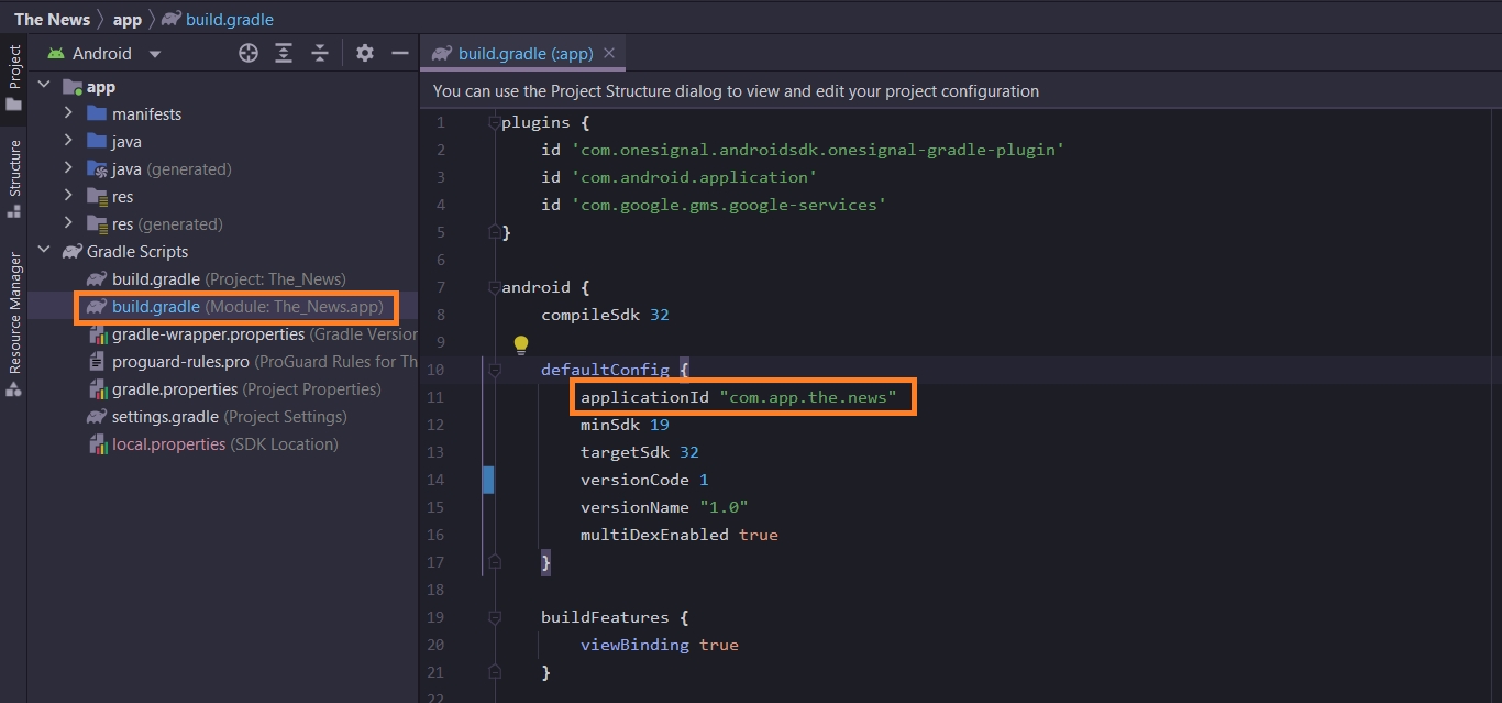 Change the id as unique as possible, because application id is very important used if you want to publish the application to the google play.
